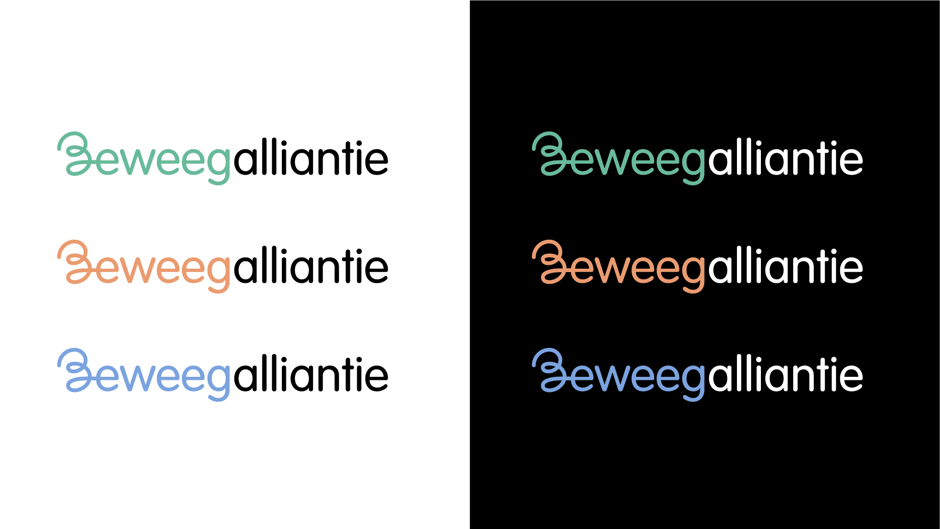 Bij een dynamische en positieve organisatie als Beweegalliantie hoort een dynamisch en positief logo. De iconische beginletter ‘B’ van het logo beweegt in een vloeiende lijn vooruit in verbinding met de rest van het woordmerk. De vloeiende vorm geeft het logo een moeiteloze vanzelfsprekendheid. Het lettertype dat we voor het logo, en voor alle communicatie, gebruiken is vriendelijk, rond en toegankelijk.