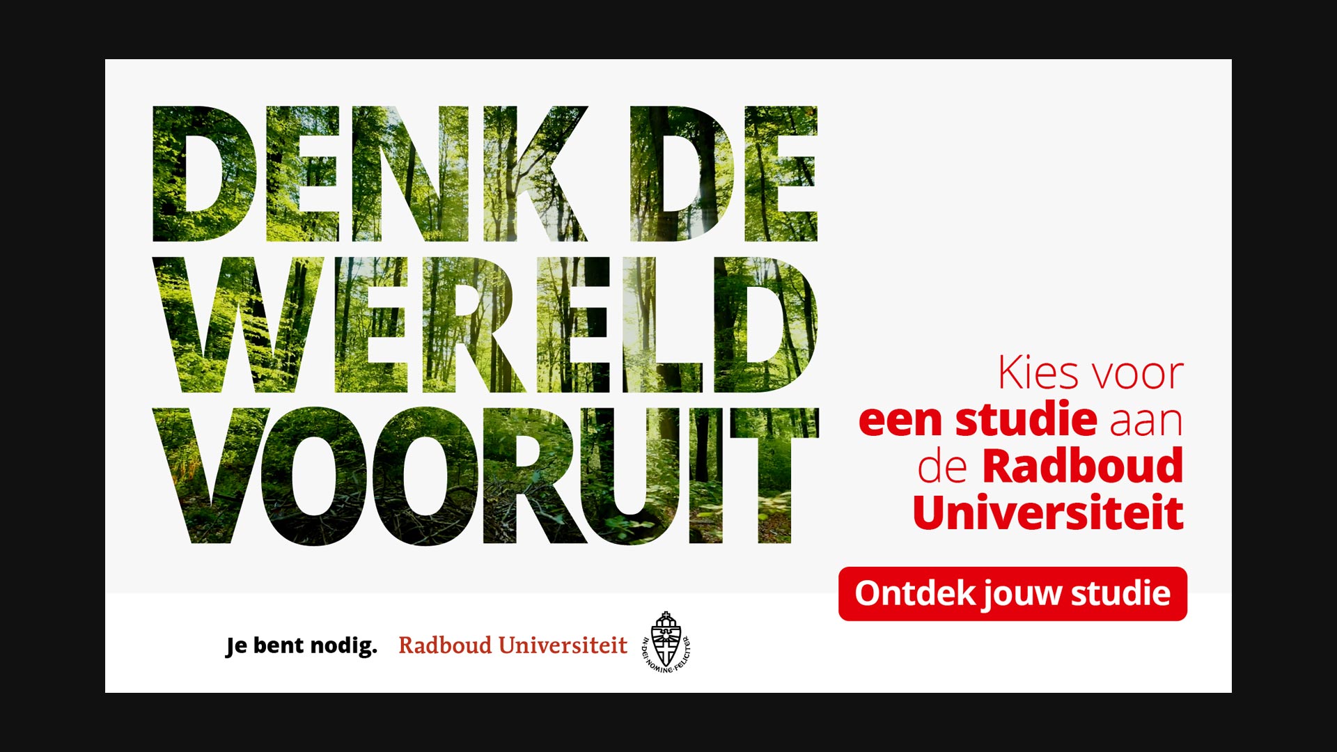 De manier waarop “Denk De Wereld Vooruit” zich manifesteert is bijzonder. Het is een groot typografisch ‘venster’, waarachter Radboud een toekomstperspectief schetst. Met dit format kan elke faculteit zijn eigen thema’s onder de aandacht brengen. In een filmische animatie voltrekt zich in enkele seconden een contrasterend beeld vanuit een situatie naar een toekomstperspectief. En we eindigen met een ‘call-to-action’ richting bachelorstusies, masterstudies, of een Open Dag.