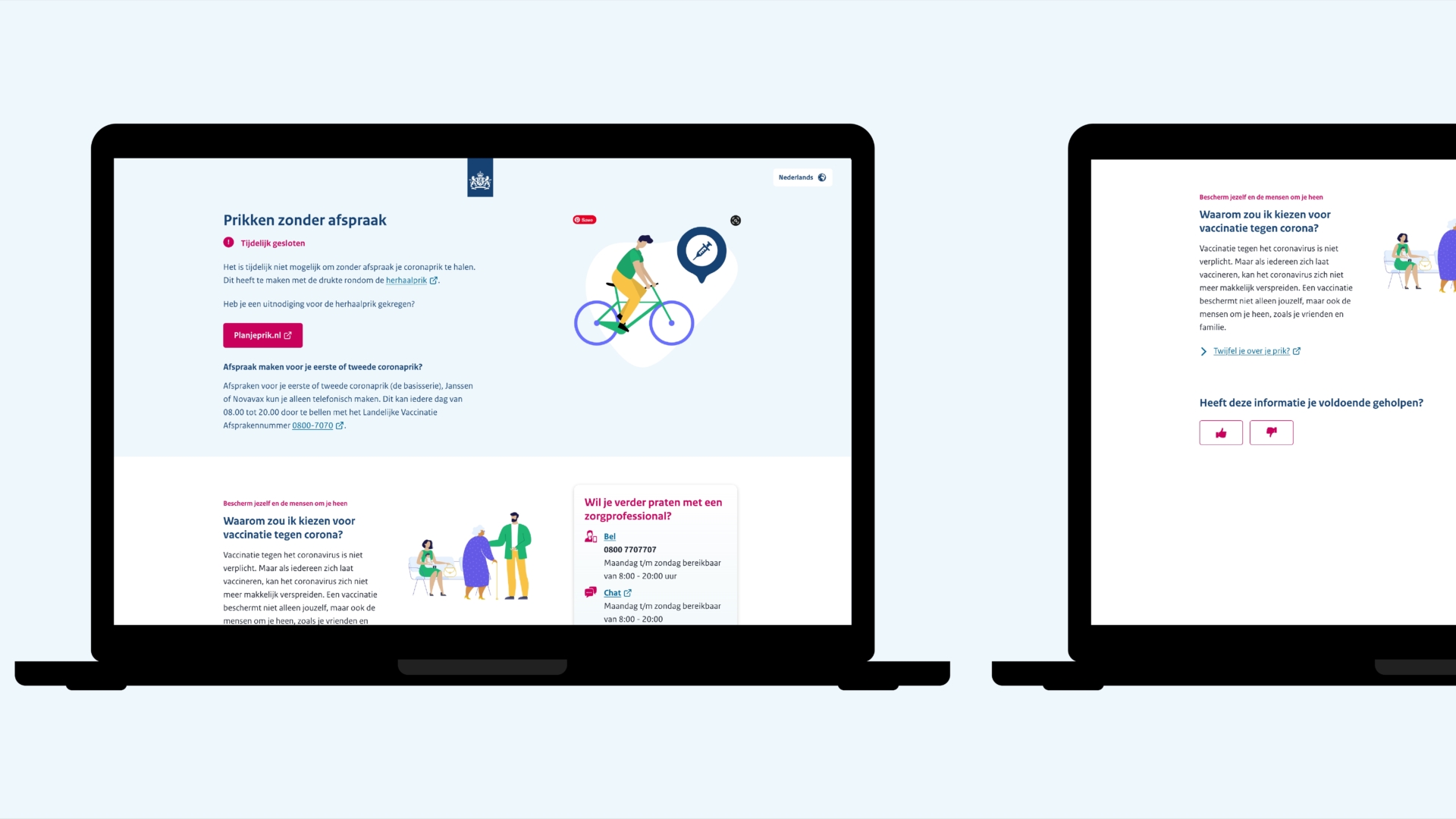 Vervolgens lag het nieuwe probleem al klaar. De vaccinatiecampagne – geleid door RIVM – was in volle gang. Deze werd in leeftijdscohorten uitgevoerd. Niet iedereen liet zich echter vaccineren, en in juni 2021 waren alle leeftijden al aan bod gekomen. Gevraagd werd om een vervolgstrategie. Deze werd gevonden in een nieuw narratief: ‘Elke prik telt’, en het platform prikkenzonderafspraak.nl. Het idee bleek even simpel als doeltreffend. Het werden het centrale narratief en platform vanuit de overheid, met nadruk benoemd in de persconferentie door Minister De Jonge. Het was ook een eerste succesvolle integratie tussen alle vaccinatielocaties van alle regionale GGD’s met VWS samen.