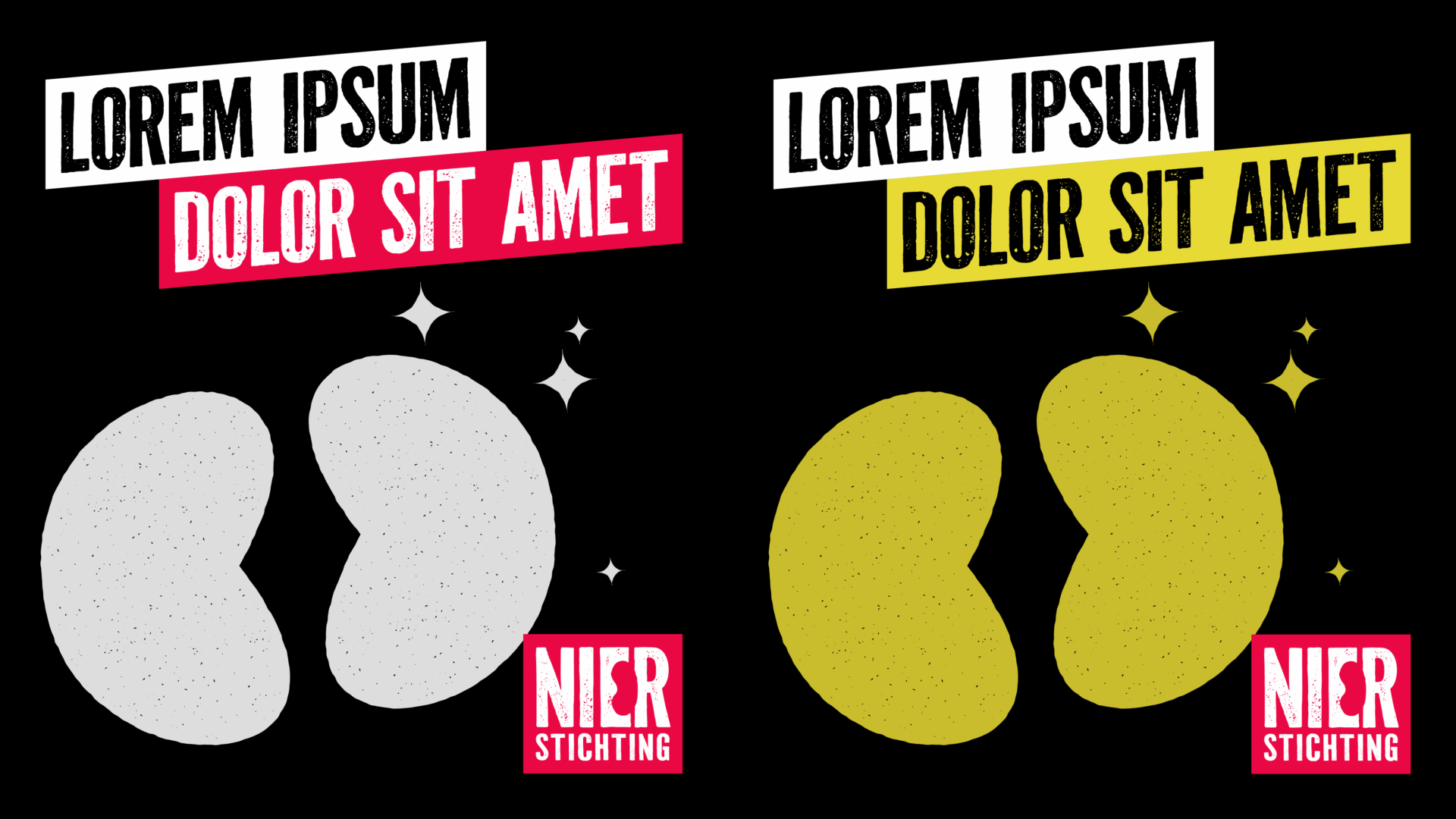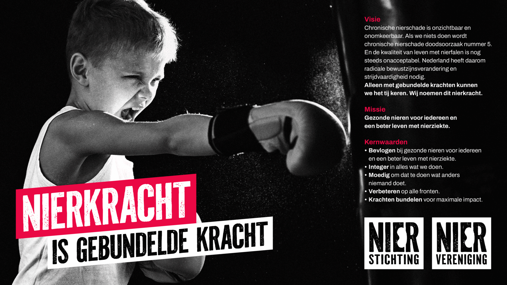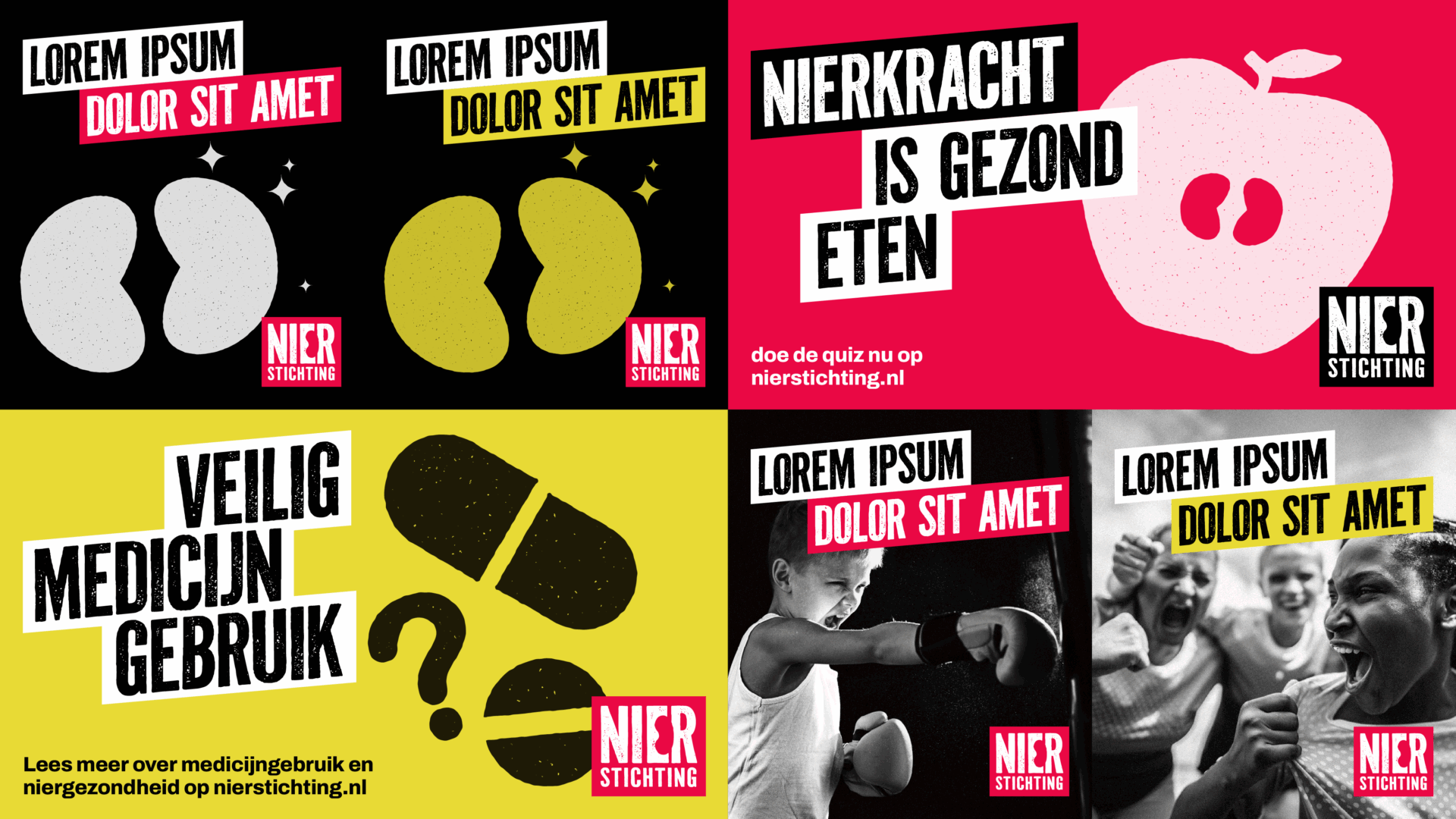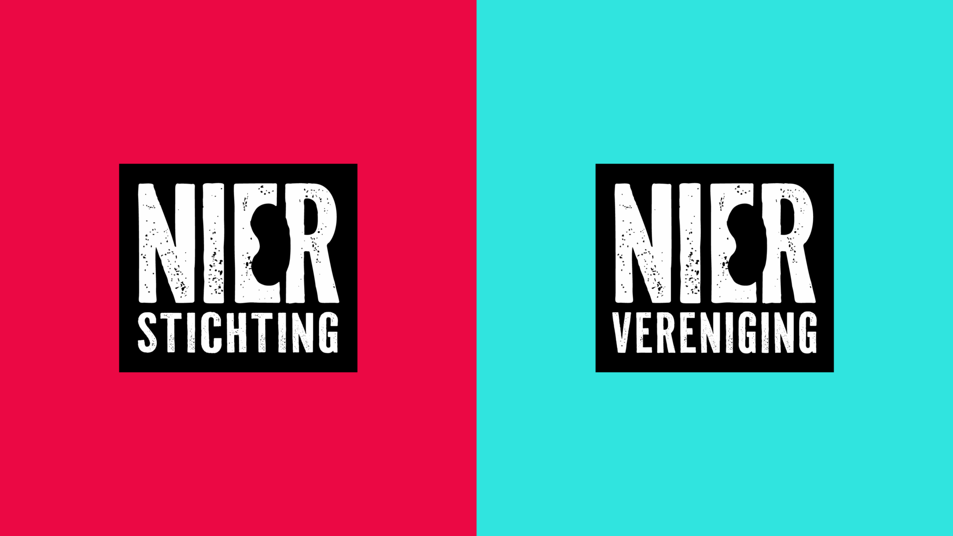 Het logo is een krachtig woordmerk waarin subtiel een niervorm is verwerkt. De ruwe, robuuste typografie benadrukt de activistische toon. De kleuren van beide organisaties zijn onderscheidend maar verwant: rood, geel, zwart en wit voor de Nierstichting, blauw, rood, zwart en wit voor de Niervereniging. Beide paletten worden ondersteund door een gezamenlijk flexibel secundair kleurensysteem.